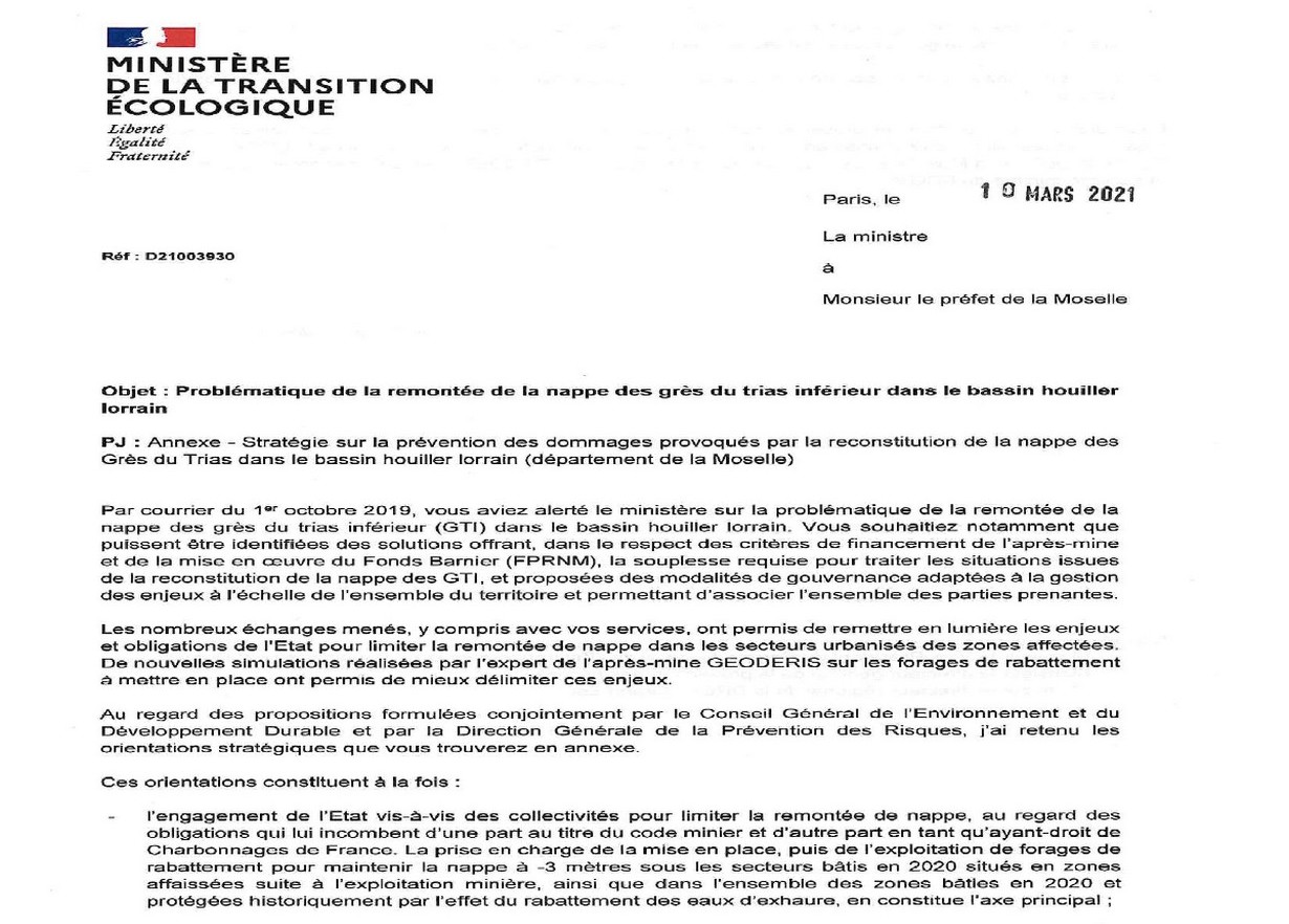 L’Etat s’engage vis-à-vis des collectivités pour limiter la remontée de nappe, au regard des obligations qui lui incombent au titre du code minier et en tant qu’ayant droit de Charbonnage de France.